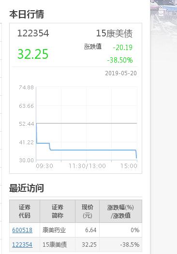 10時00分恢復交易后,“15康美債”下跌到36元。上交所再發(fā)公告,決定自2019年05月20日10時03分開始暫?!?5康美債”交易,自2019年05月20日14時57分起恢復交易。