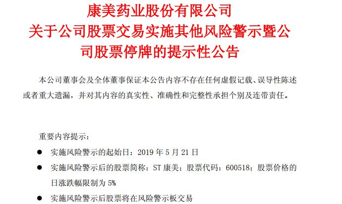 中國食品藥品網(wǎng)訊(記者 落楠) 5月17日晚,康美藥業(yè)發(fā)布公告稱,公司股票將于2019年5月21日起實施其他風險警示,實施風險警示后A股股票簡稱由“康美藥業(yè)”變更為“ST康美”,股票價格的日漲跌幅限制為5%。5月20日,康美藥業(yè)股票停牌1天,但康美藥業(yè)發(fā)行的公司債券“15康美債”三度狂跌,兩度暫停交易。