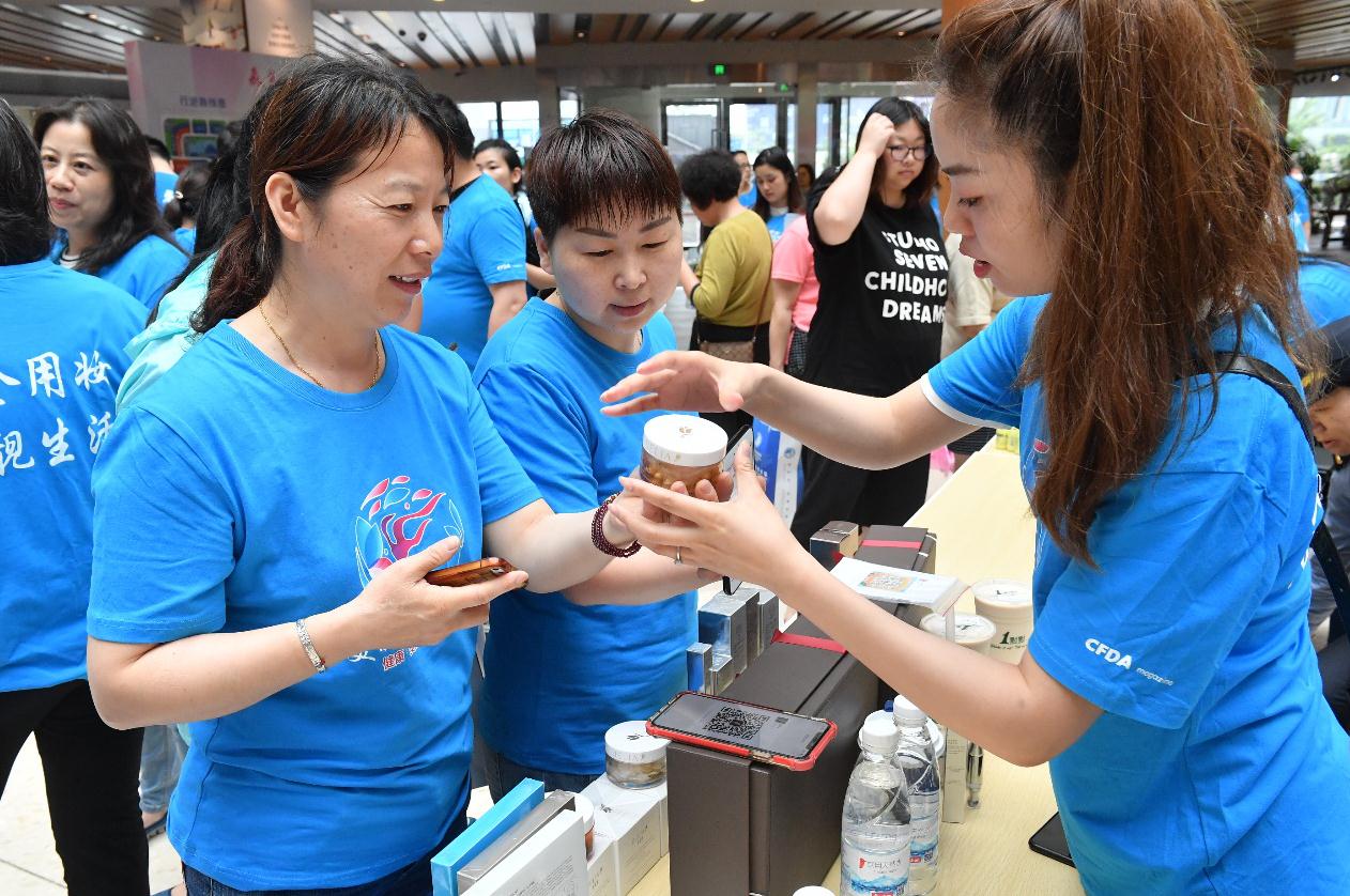 圖為《中國(guó)食品藥品監(jiān)管》雜志社展臺(tái)前答題得獎(jiǎng)品的參與者。郭婷 攝