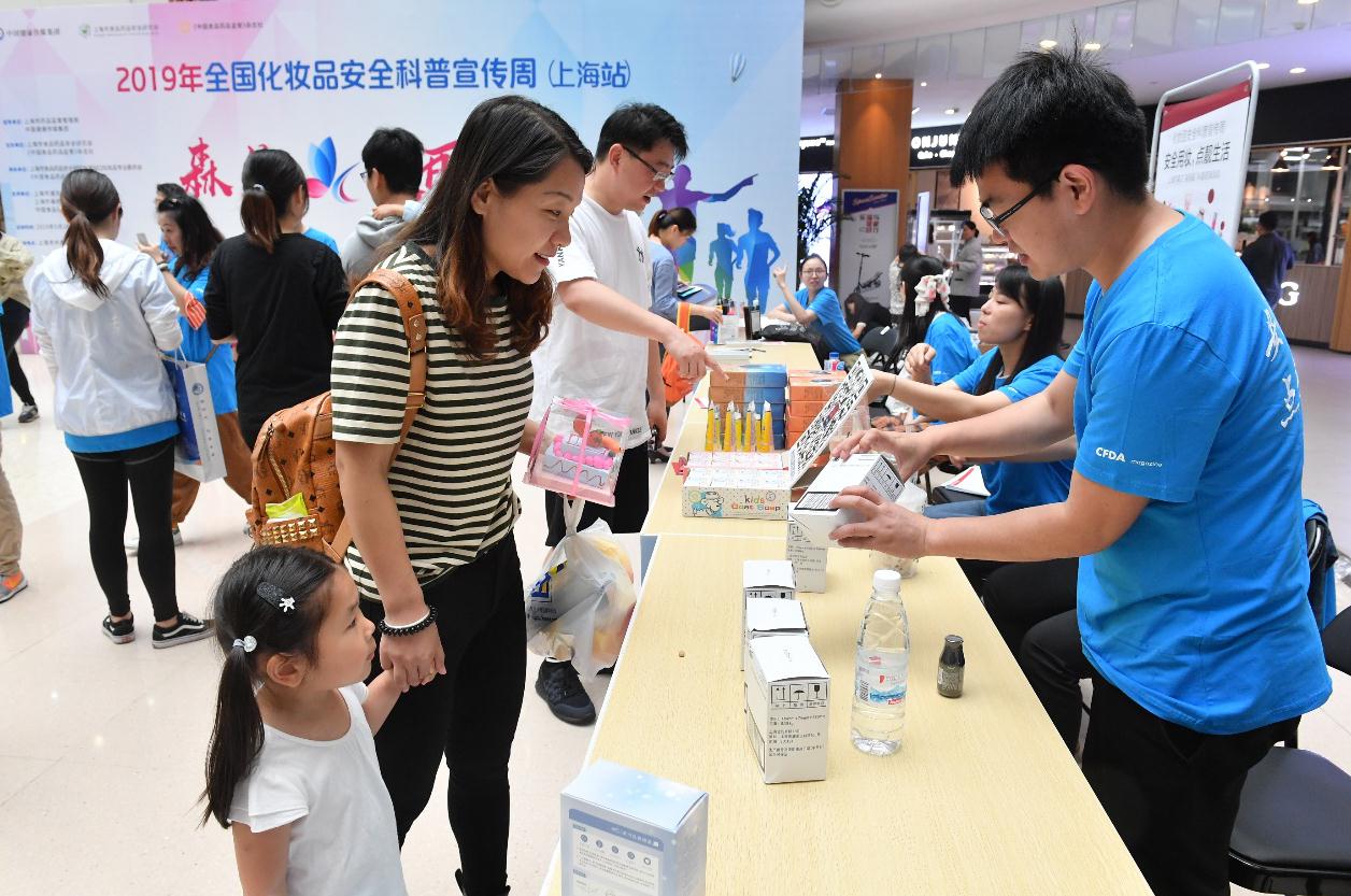 在上海市浦東新區(qū)市場(chǎng)監(jiān)管局設(shè)置的展臺(tái)前,身穿制服的監(jiān)管人員正在給圍觀市民講解化妝品選購(gòu)常識(shí)、安全用妝、化妝品不良反應(yīng)等基本知識(shí),發(fā)放化妝品知識(shí)宣傳手冊(cè)等。