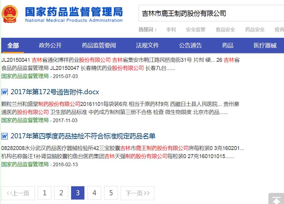 記者查閱國家藥監(jiān)局官網(wǎng)得知,在2018年8月24日、2018年7月3日、2018年2月13日、2017年1月11日國家藥品監(jiān)管部門發(fā)布的藥品不合格名單與不符合標準規(guī)定的藥品名單中,都出現(xiàn)了標示為吉林市鹿王制藥股份有限公司生產(chǎn)的產(chǎn)品。