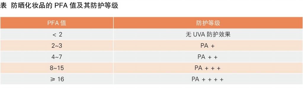SPF值是評定產(chǎn)品對UVB的防護效果,與之對應(yīng)的是PFA(Protection Factor of UVA)值,它反映的是產(chǎn)品對UVA的防御效果。當防曬品的實測PFA值<2時,不得標識UVA防護效果;2≤PFA值<16時,可根據(jù)其數(shù)值標識相應(yīng)的PA等級(PFA值與PA等級的對應(yīng)關(guān)系見表)。