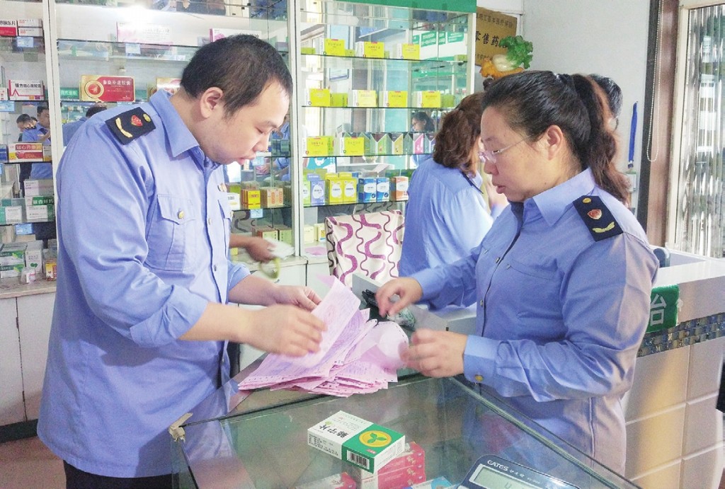 圖為執(zhí)法人員在一家藥店檢查藥品采購票據(jù)。彭禹銘 攝