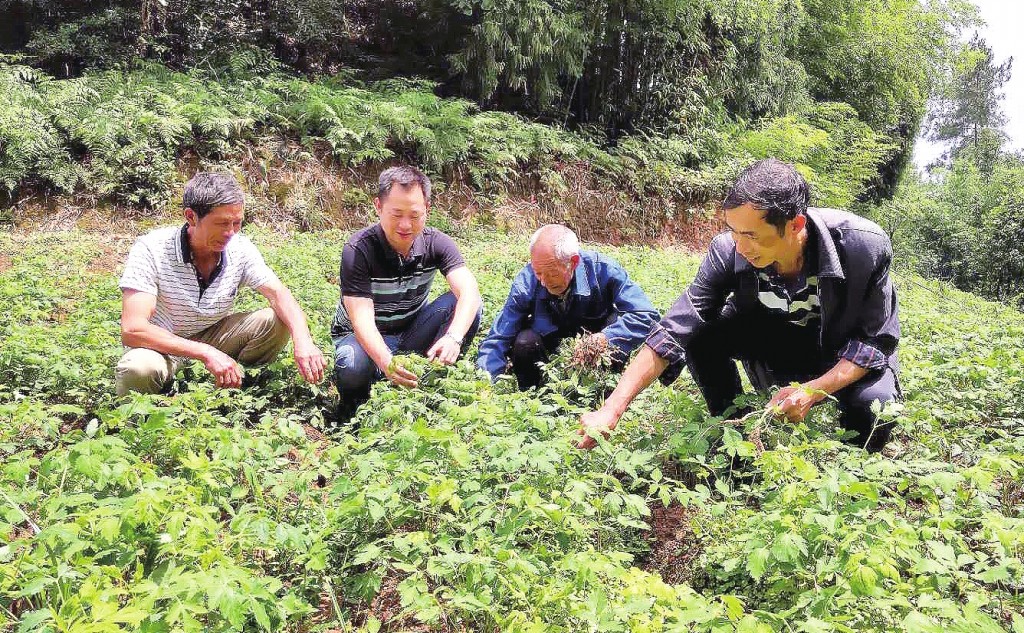 圖為該局扶貧工作隊隊員(左二)查看貧困戶種植的中藥材生長情況。文光輝 攝