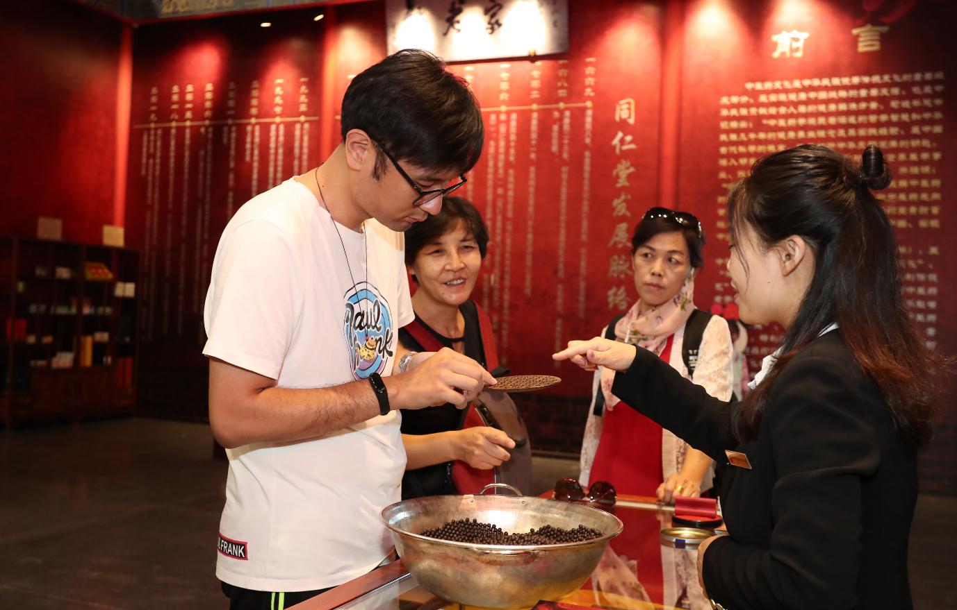 圖為本草印象館工作人員正在為游客介紹聞藥。落楠 攝