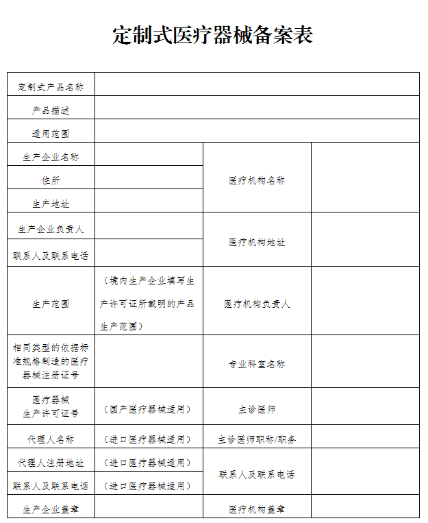 第八條 醫(yī)療器械生產(chǎn)企業(yè)及醫(yī)療機構(gòu)共同作為定制式醫(yī)療器械備案人,在生產(chǎn)、使用定制式醫(yī)療器械前應(yīng)當(dāng)向醫(yī)療器械生產(chǎn)企業(yè)所在地(進口產(chǎn)品為代理人所在地)省、自治區(qū)、直轄市藥品監(jiān)督管理部門備案。備案資料符合形式要求的,省、自治區(qū)、直轄市藥品監(jiān)督管理部門當(dāng)場予以備案(見附1—3)。備案資料不齊全或者不符合規(guī)定形式的,應(yīng)當(dāng)一次告知需要補正的全部內(nèi)容。對不予備案的,應(yīng)當(dāng)告知備案人并說明理由。