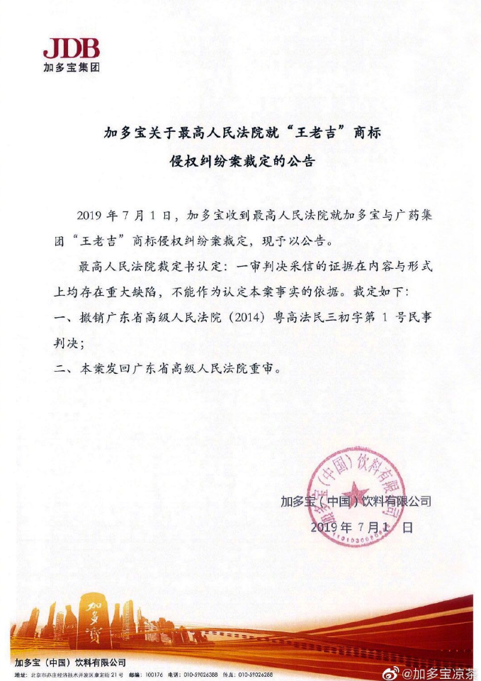 中國(guó)食品藥品網(wǎng)訊 (記者 蔣紅瑜) 7月1日,加多寶公司微博帳號(hào)發(fā)布一則《加多寶關(guān)于最高人民法院就“王老吉”商標(biāo)侵權(quán)糾紛案裁定的公告》(以下簡(jiǎn)稱《公告》)?!豆妗凤@示,最高人民法院就“王老吉”商標(biāo)侵權(quán)糾紛案裁定書認(rèn)定,一審判決采信的證據(jù)在內(nèi)容與形式上均存在重大缺陷,不能作為認(rèn)定本案事實(shí)的依據(jù)。裁定如下:撤銷廣東省高級(jí)人民法院(2014)粵高法民三初字第1號(hào)民事判決;本案將發(fā)回廣東省高級(jí)人民法院重審。