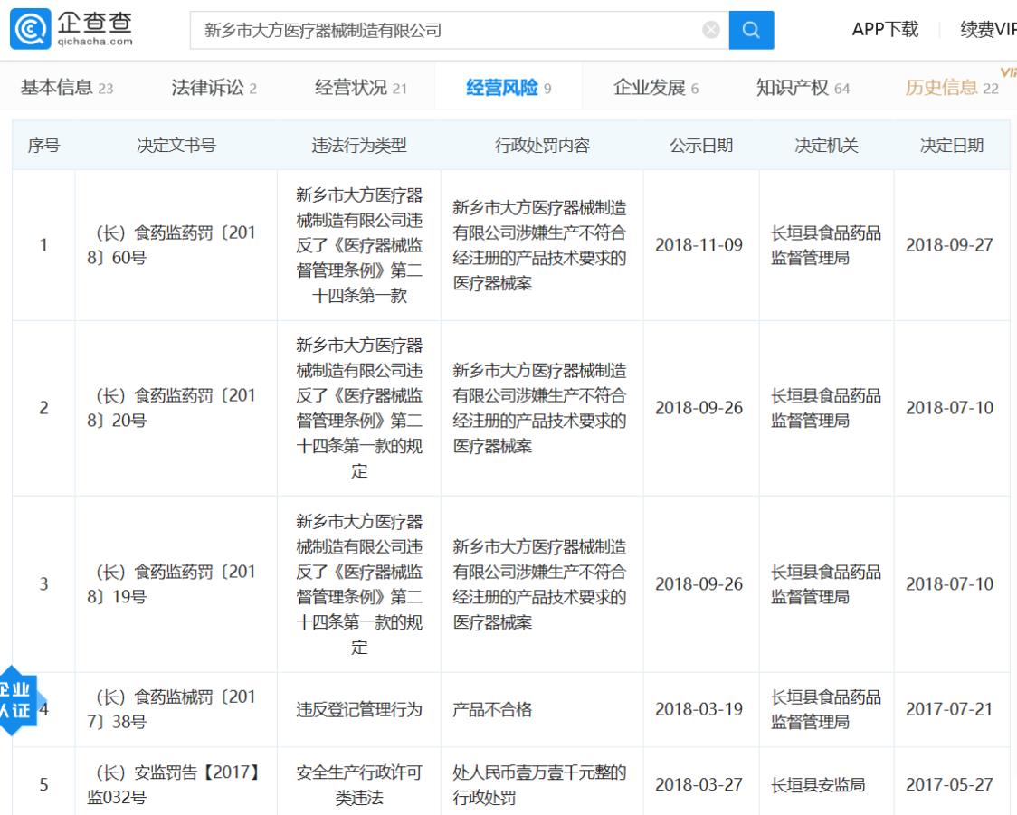 企查查平臺(tái)登記信息顯示,新鄉(xiāng)大方醫(yī)療公司經(jīng)營范圍包括勞保用品、衛(wèi)生用品、醫(yī)療用品及醫(yī)療輔助用品制造和銷售等。該企業(yè)還多次受到行政處罰,涉案生產(chǎn)不符合經(jīng)注冊的產(chǎn)品技術(shù)要求的醫(yī)療器械案。