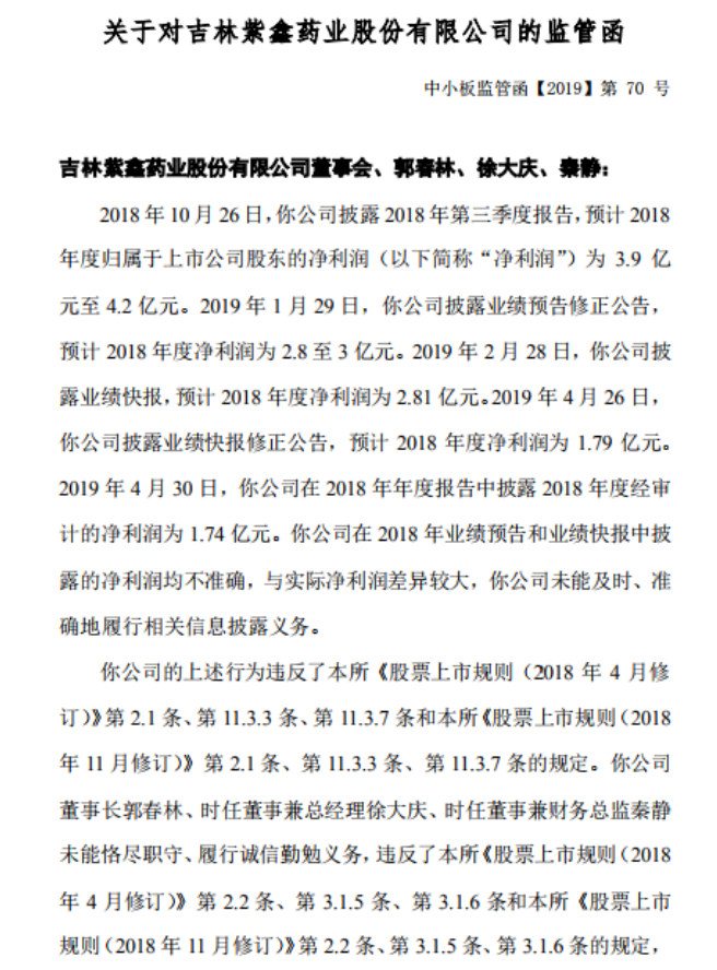 中國食品藥品網(wǎng)訊(記者 落楠) 5月27日,深圳證券交易所中小板公司管理部向吉林紫鑫藥業(yè)股份有限公司(以下簡稱紫鑫藥業(yè))發(fā)出監(jiān)管函。據(jù)監(jiān)管函,紫鑫藥業(yè)2018年10月以來披露的信息中,2018年度歸屬于上市公司股東的凈利潤(以下簡稱凈利潤)數(shù)度修正,從預計為3.9至4.2億元最終“縮水”到1.74 億元。