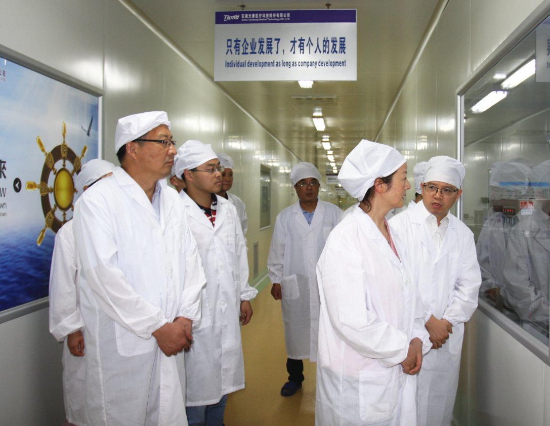 圖為安徽省藥品監(jiān)督管理局黨組書記、局長吳麗華一行深入安徽省天長市天康醫(yī)療用品有限公司調(diào)研。 蔣守福 攝