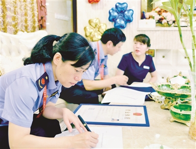 圖為該局執(zhí)法人員向一家美容養(yǎng)生會所下達(dá)化妝品安全監(jiān)管告知書/攝影 黃躍輝